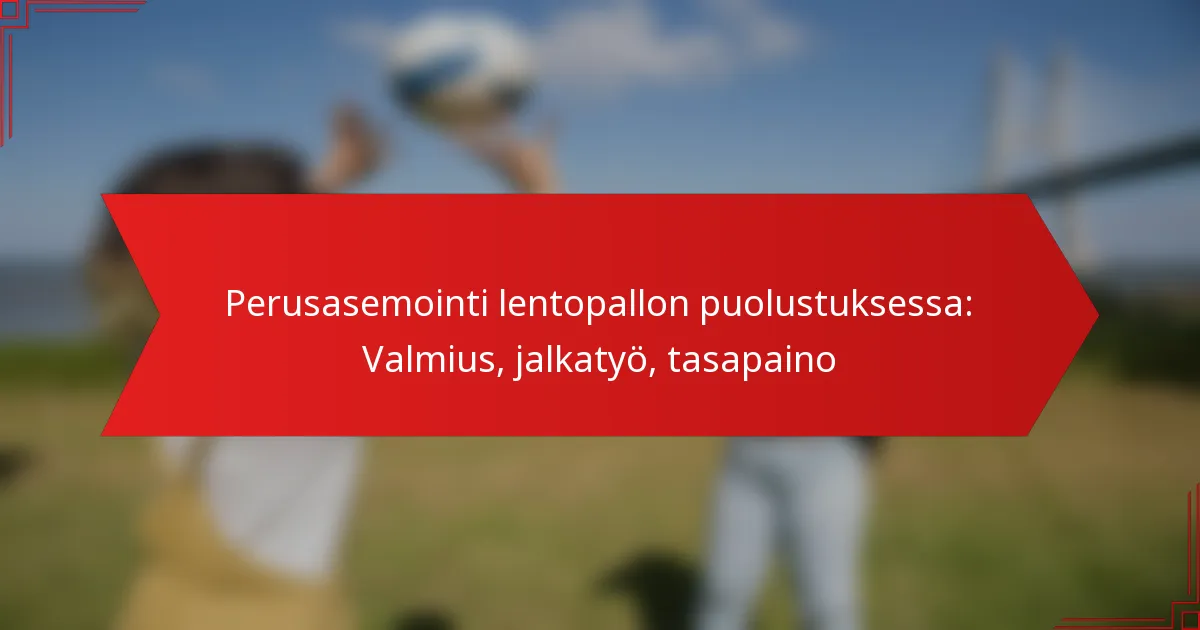 Perusasennon parantaminen lentopallon puolustuksessa sisältää yhdistelmän yksilöllisiä harjoituksia, joukkueharjoituksia ja visuaalisia oppimistyökaluja. Nämä menetelmät keskittyvät valmiuden, jalkatyön ja tasapainon parantamiseen, jotka ovat ratkaisevia tehokkaassa puolustuspelaamisessa.